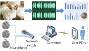 Broilers produce abnormal sounds such as cough and snore when they suffer from respiratory diseases. The aim of this research work was to develop a method for broiler abnormal sound detection. The sounds were recorded in a broiler house for one week (24/7). There were 20 thousand white feather broilers reared on the floor in a building. Results showed that the developed recognition algorithm, using wavelet transform Mel frequency cepstrum coefficients (WMFCCs), correlation distance Fisher criterion (CDF), and hidden Markov model (HMM), provided an average accuracy, precision, recall, and F1 of 93.8%, 94.4%, 94.1%, and 94.2%, respectively, for broiler sound samples. The results indicate that sound analysis can be used in broiler respiratory assessment in a commercial broiler farm.